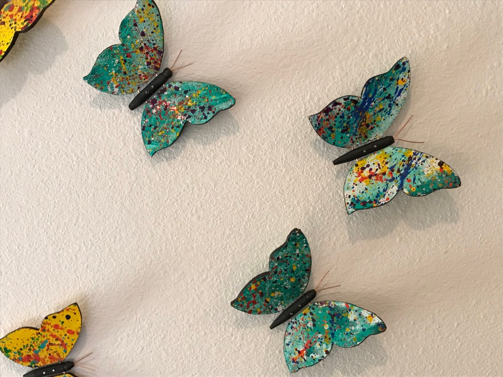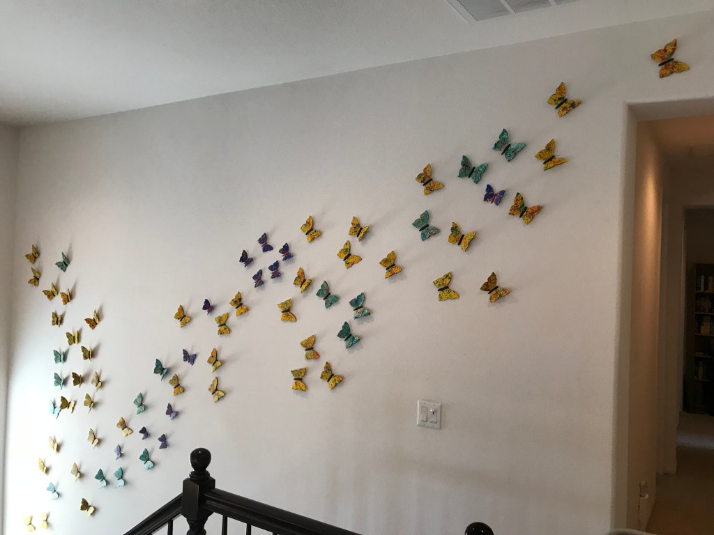 Each butterfly measures approximately 5″ x 5″. This came out of a really fun trip we made with some friends to Santa Fe, New Mexico. We strolled through the town and many of its great galleries and shops. One gallery had a number of bronzed butterflies on the wall, and my mind began to race. ”How can I brighten this up?”. At the same time we had struggled with wall art for our entry stairway. Turns out a kaleidescope of over 70 butterflies was just what the doctor ordered!