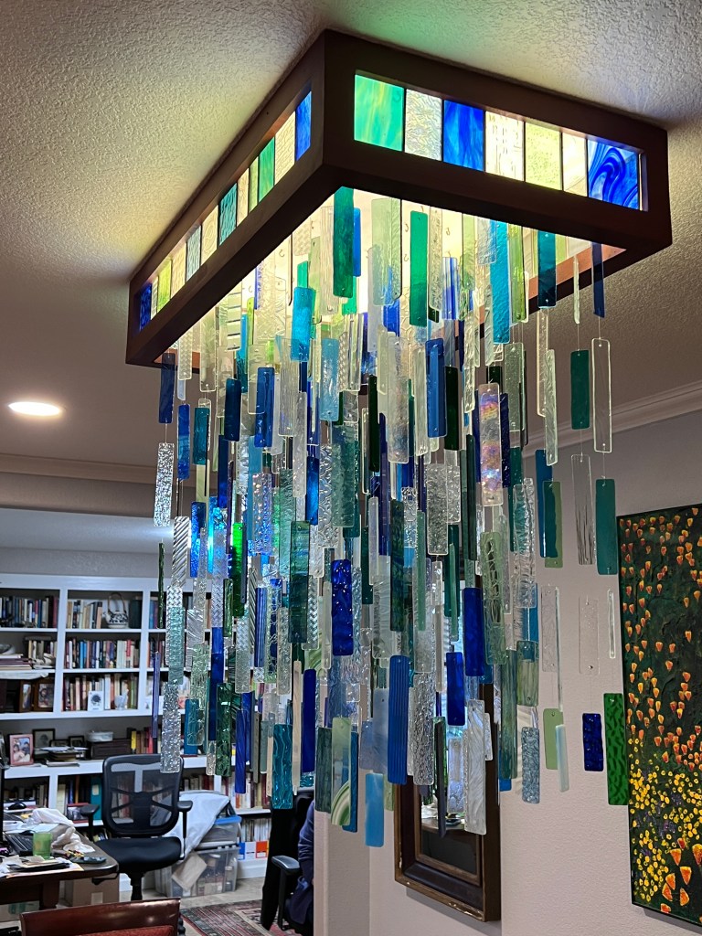 LED lit with stained glass surround and 90 glass drops. We were struck by Pae White’s hanging centerpiece in a Las Vegas boutique and worked for years how we could create such an effect in our home. We finally came to this design.