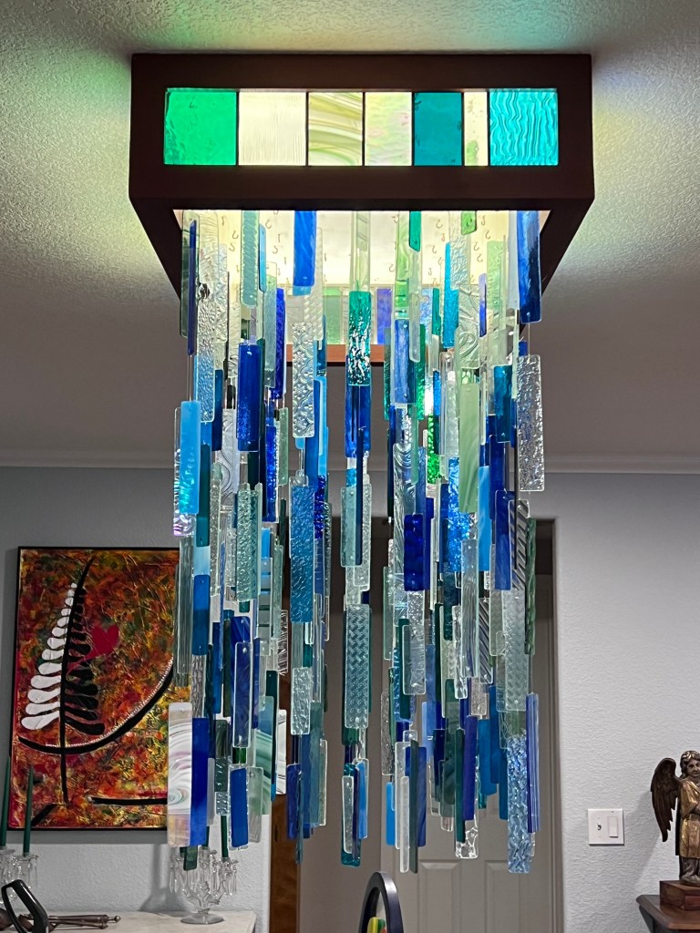 This was a collaboration between Sara and I. I made the box and wiring, while Sara concentrated on the glass. We drilled and pieced around 360 pieces to make the drops.