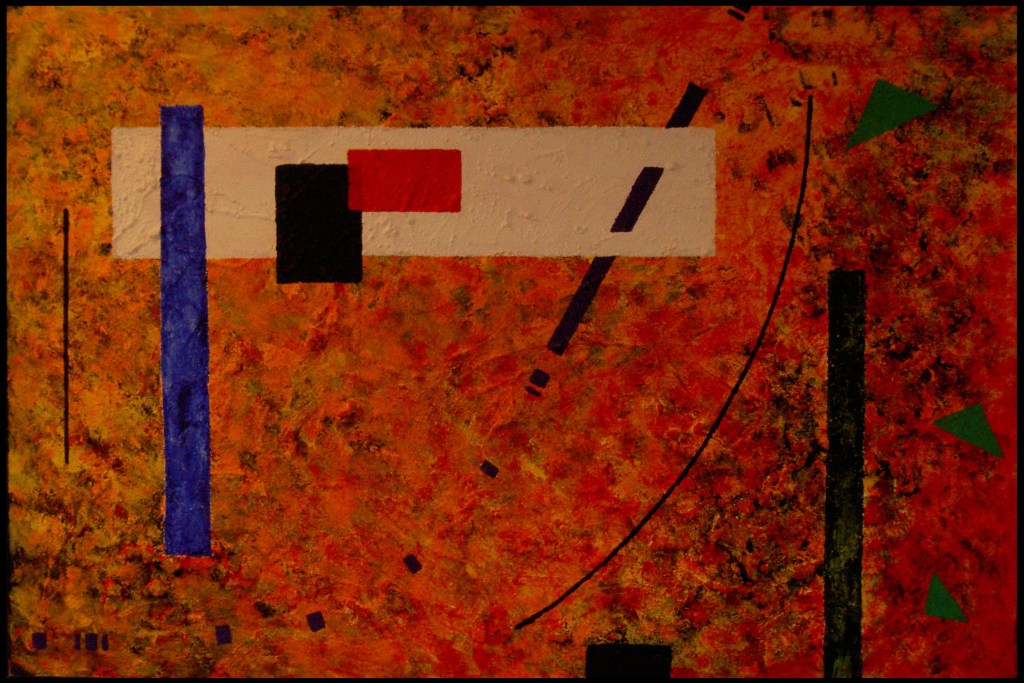 36″ x 54″ mixed media. At Sara’s urging, I began experimenting with color coutouts, leading to this configuration. Very intriguing.