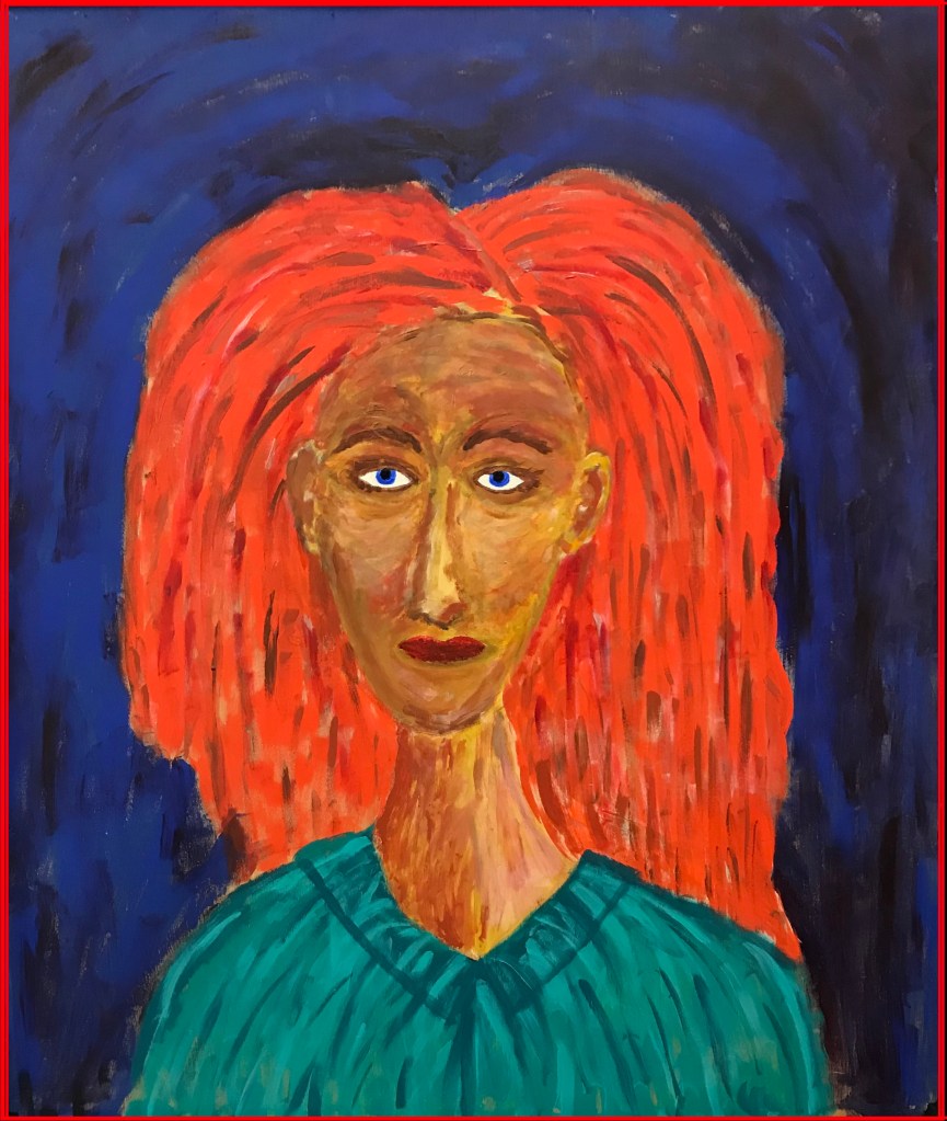 42″ x 36″ Acrylic on Wood. Red is my studio muse. She was inspired by Van Gough’s “Portrait of a Peasant”. When you see such master works, they come alive. I just had to paint something like it. The result is not close, but inspired nonetheless. Fun with Big Hair. It took me years to get the eyes right. Finally, Lee Wilder Snider helped me bring them to earth. Red has been looking at me in the studio for 10 years at least (her eyes follow me around). At first the frame was black (like most of my simple frames). I tried orange and WOW!