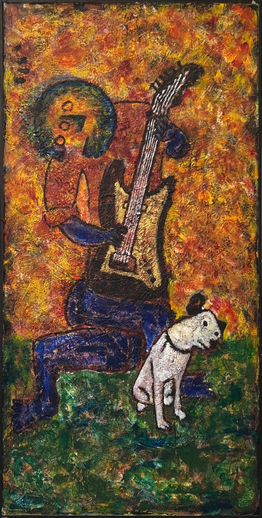 60″ x 31″ Mixed Media. When I started working at Fender I knew I needed to present myself as an artist. I was surrounded by musicians – some of them quite brilliant musicians. This painting was inspired by Picaso’s Old Man with Guitar. I painted it on an old closet door and it was a bit long so I filled it in with the RCA Dog. I like to think Picaso would have smiled.