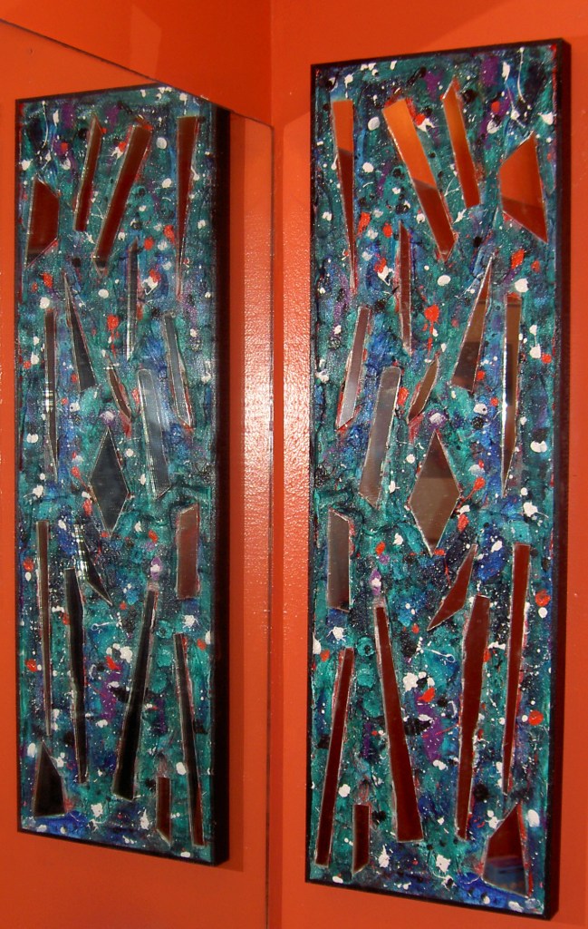 33″ x 12″ (2 pcs) mixed media. Difficult to match a brightly colored bathroom for Maggie and Henry – ended up painting the opposite color and it worked. The contrast in colors along with the embedded mirrors really pop in a tight space. We hung them on either side of a large mirror. Embrace the space!