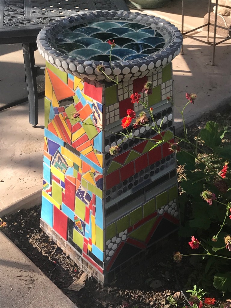 36″ x 20″ mosaic bowl on fiberglass base. Sara and I love to make mosaics. We started with a very ambitious fountain in Vista when our children were young. This is part of a series we made for our Murrieta house. It was light enough to move due to its hollow fiberglass base (upside down planter) we could move it. Glad we did! Completely different set of birds in Northern California but delightful.